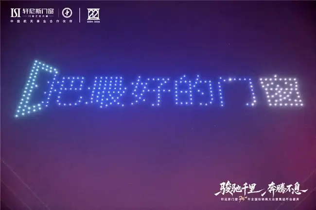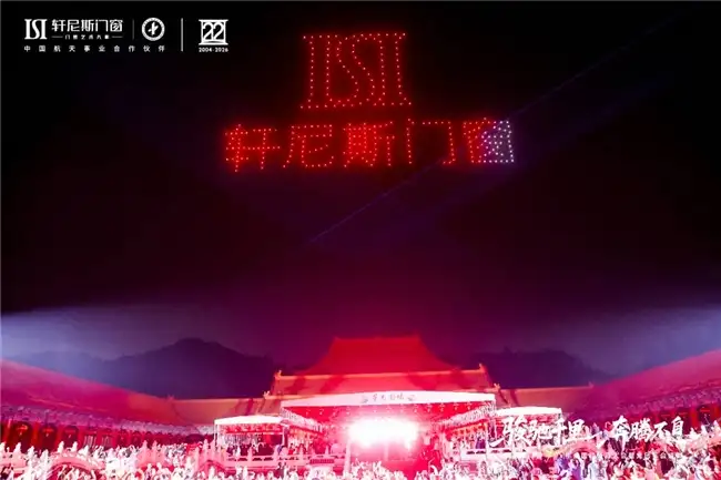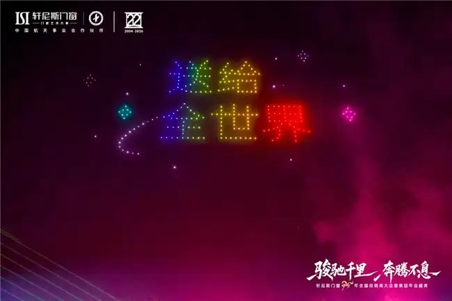 骏驰寰宇,航天赋能,年会盛典巧妙地融合了品牌的另一崇高基因——航天。作为中国航天事业合作伙伴,“航天品质”已融入轩尼斯门窗的产品哲学里。晚会上,一场航天主题无人机表演点亮夜空,杂技《追月》等节目诠释出追逐极致、探索未知的精神,生动升华了品牌的高度与格局,将“把最好的门窗,送给全世界”的宏伟愿景,化为此刻震撼人心的品牌宣言。