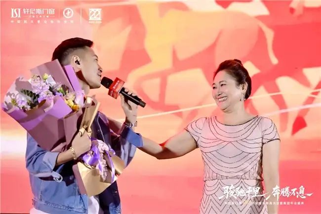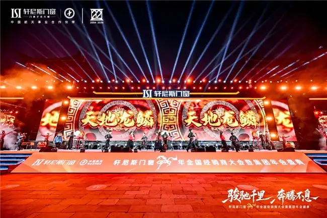 盛会以“门窗艺术大师”的深厚底蕴与“中国航天事业合作伙伴”的凌云之志为双轴,铺陈四大华章,正式拉开帷幕。由轩尼斯门窗员工磅礴唱响的开场歌曲《天地龙鳞》,以激昂旋律与雄浑词韵,瞬间点燃全场。香港歌手罗钧满登台献唱,以经典旋律引发全场共鸣。宴会声光交织,情谊共融,深刻彰显了轩尼斯门窗根植东方、联结四海的品牌向心力与文化自信。